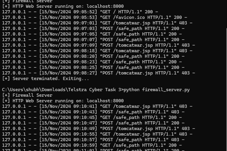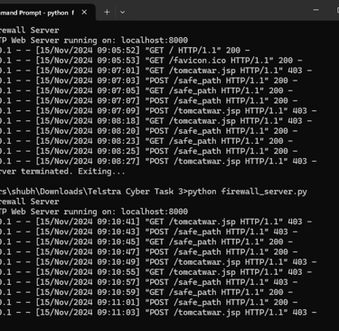We started with a simple server script (firewall_server.py) that could handle incoming HTTP requests. The server used Python’s http.server library to: